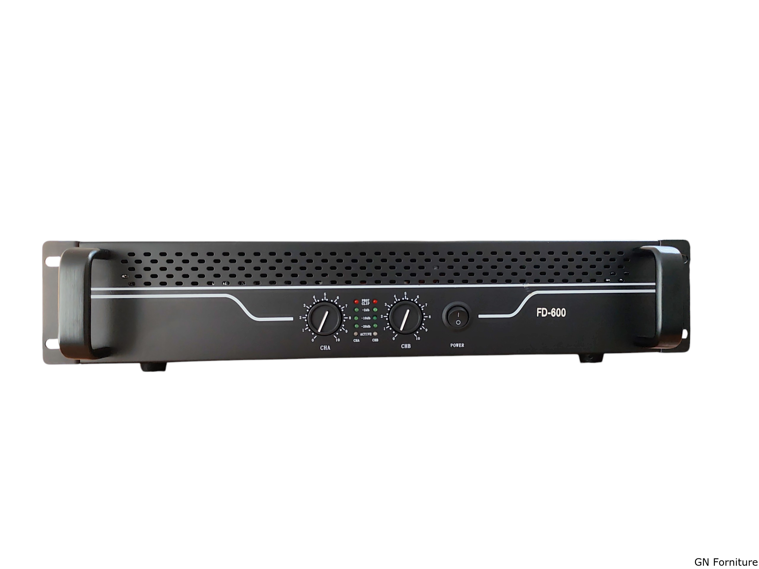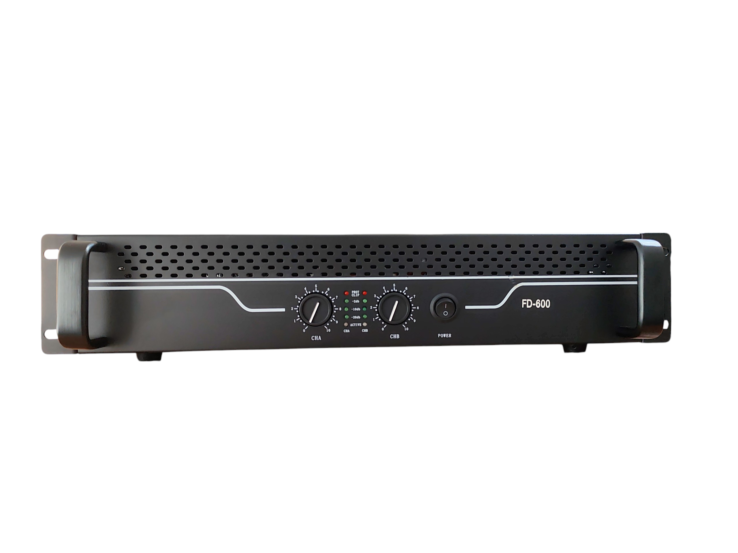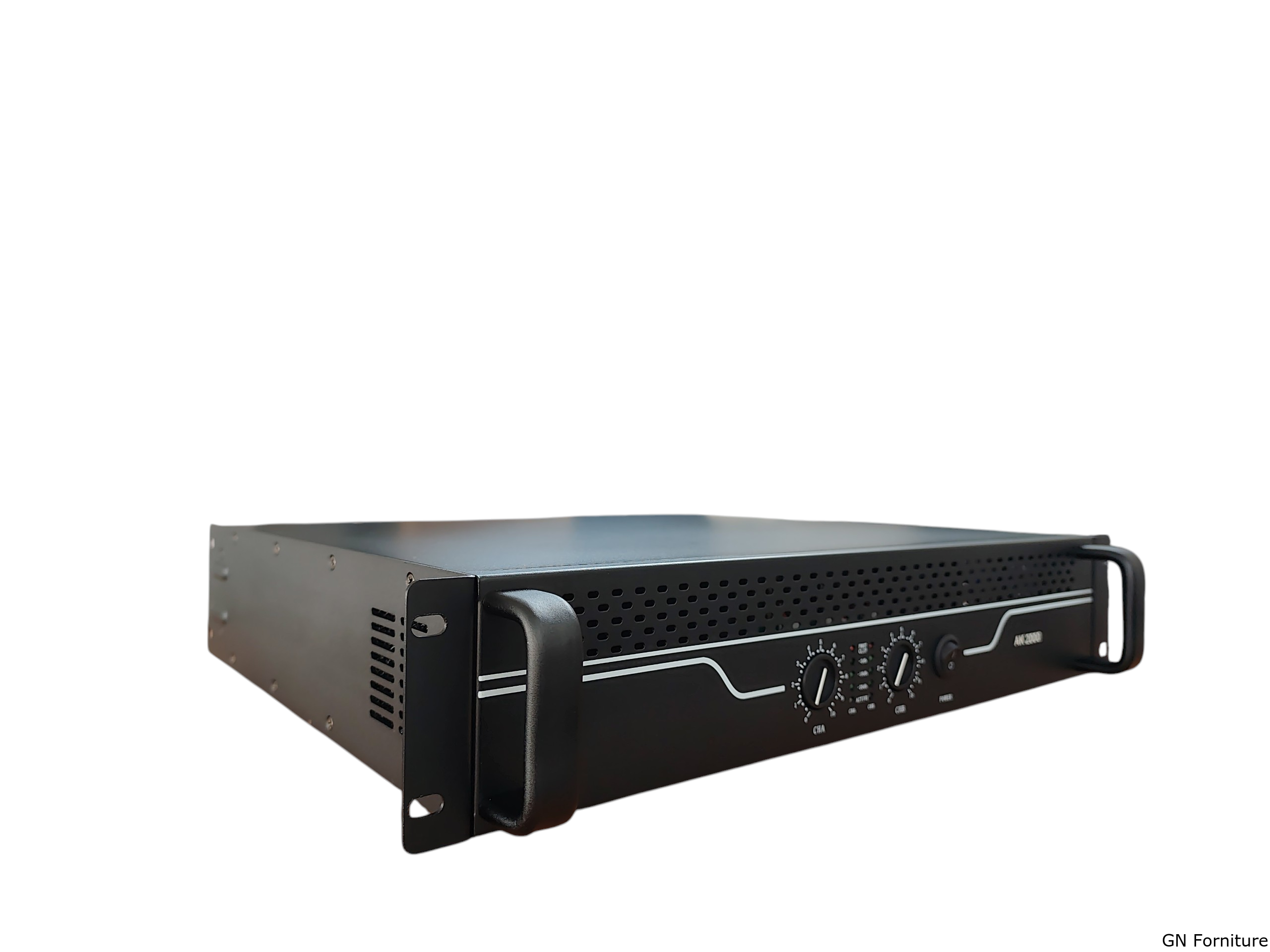Questo finale di potenza offre una potenza di 350W con funzionamento su impedenza da 8 Ohm ed è adatto alla gestione di diffusori passivi in configurazione stereo. Il pannello frontale presenta controlli di livello separati per i due canali, interruttore di accensione e indicatori LED di stato, utili per il monitoraggio immediato del segnale e del funzionamento dell’unità.