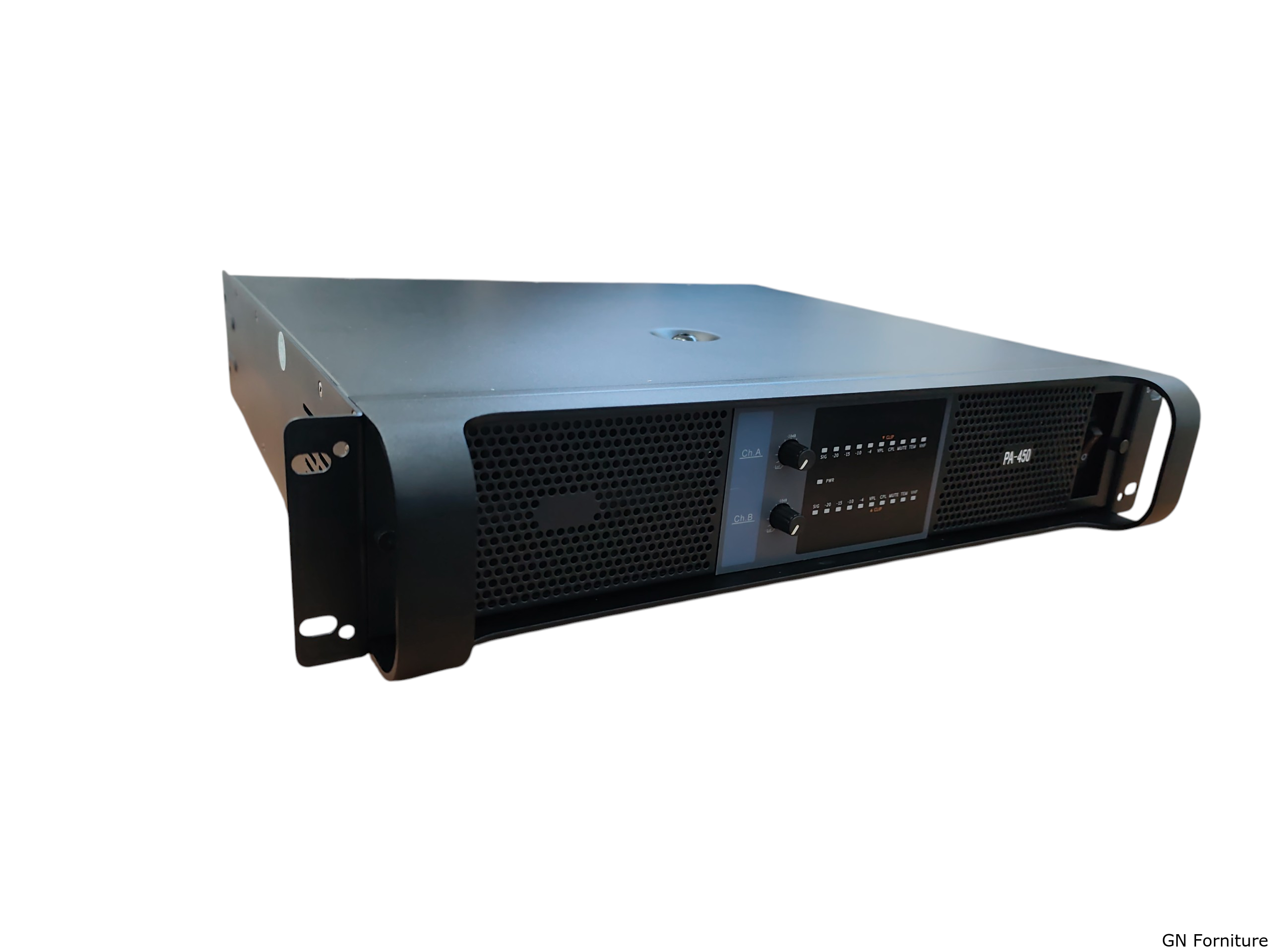 Il dispositivo lavora su 2 canali con potenza di 450W per canale a 8 Ohm, offrendo prestazioni adatte alla gestione di sistemi audio professionali dove sono richiesti controllo, efficienza e qualità di amplificazione. Il pannello frontale presenta comandi dedicati per i due canali e indicatori LED per un monitoraggio immediato dello stato operativo.