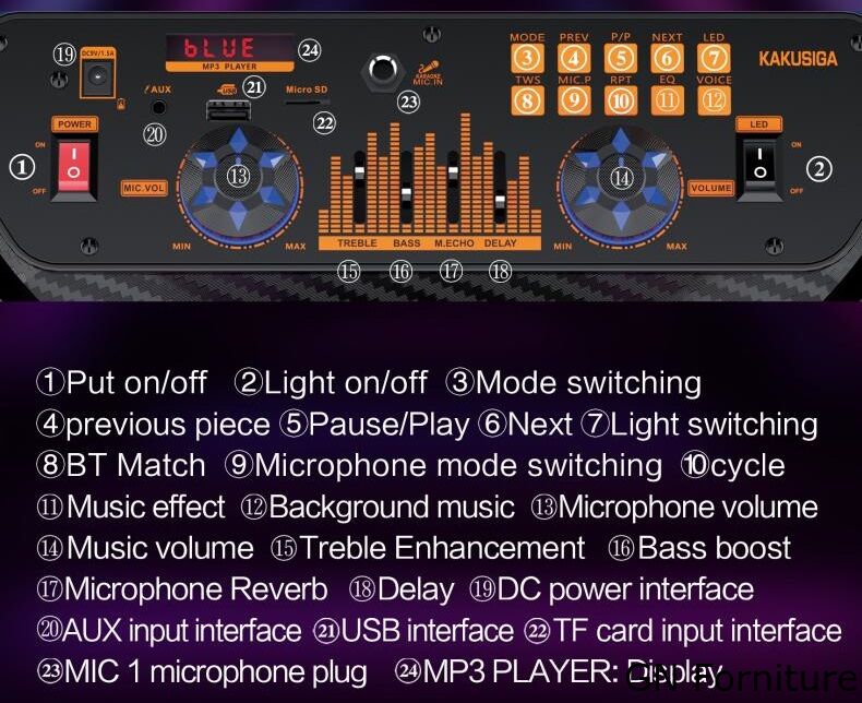 - Ingressi audio: Bluetooth TWS, scheda TF, USB, AUX e altre modalità