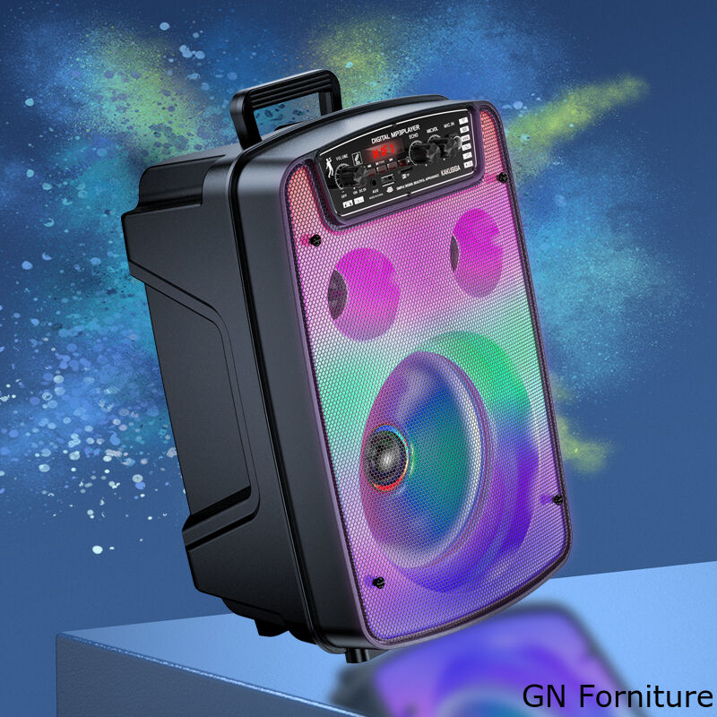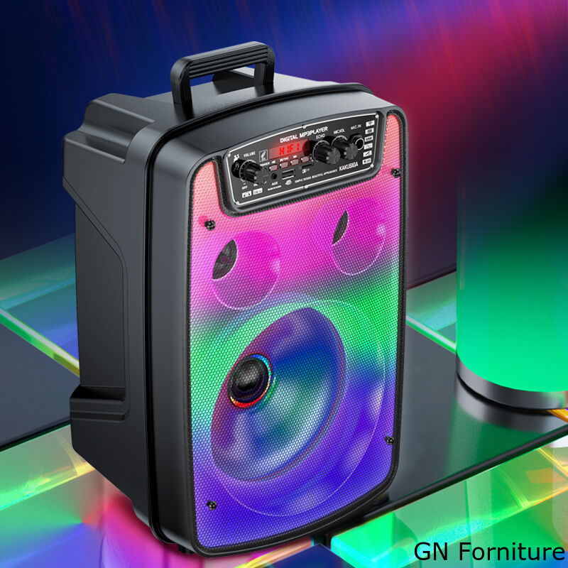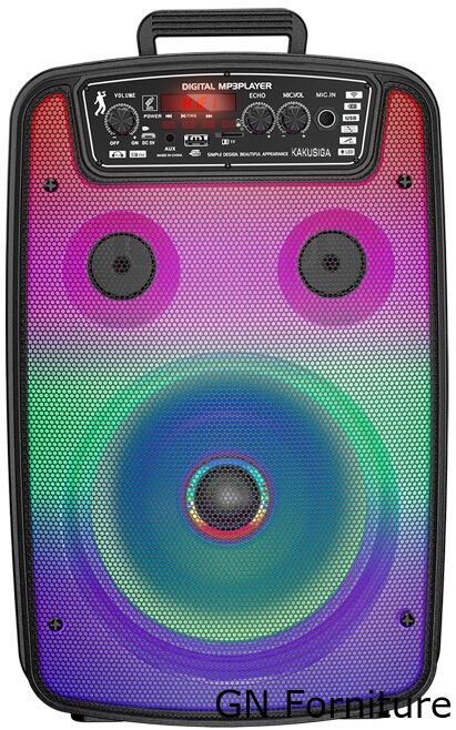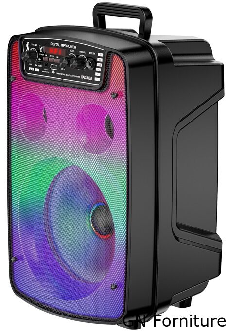 Altoparlante da otto pollici, suono dei bassi potente; Illuminazione colorata a LED, interruttore di illuminazione a tre modalità; batteria al litio di grande capacità, maggiore durata della batteria; materiale resistente all'usura e alla compressione, stabile e durevole; telecomando senza fili + microfono a filo;