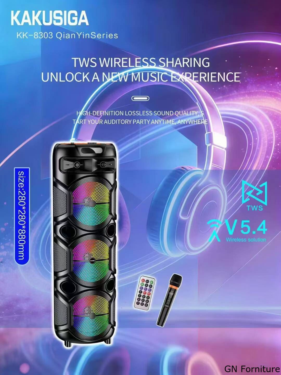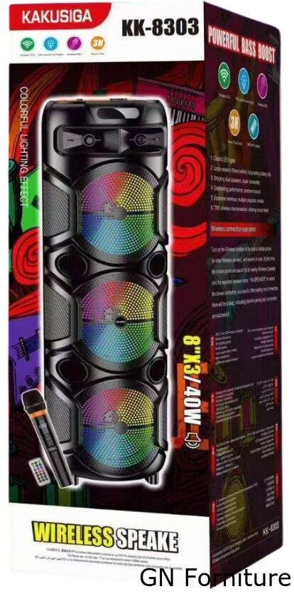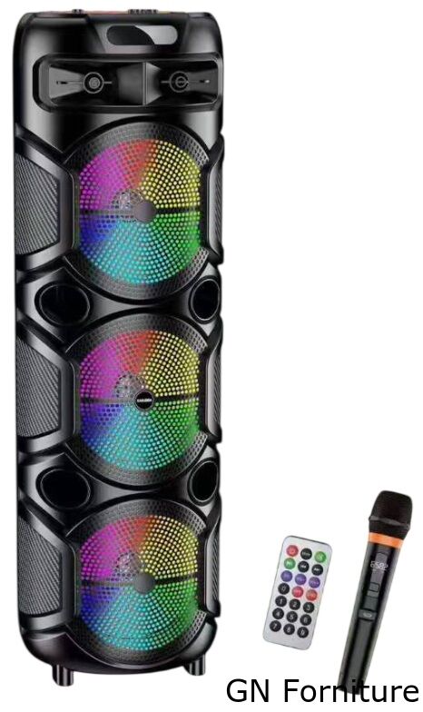 Speaker wireless portatile dal design scenografico e di forte impatto visivo, ideale per musica, karaoke, feste, eventi e momenti di intrattenimento sia in casa sia in ambienti esterni. Questo diffusore è progettato per offrire un suono potente e coinvolgente grazie alla configurazione con tre altoparlanti da 8 pollici e tweeter dedicato, accompagnati da effetti luminosi LED multicolore che rendono ogni utilizzo ancora più dinamico.