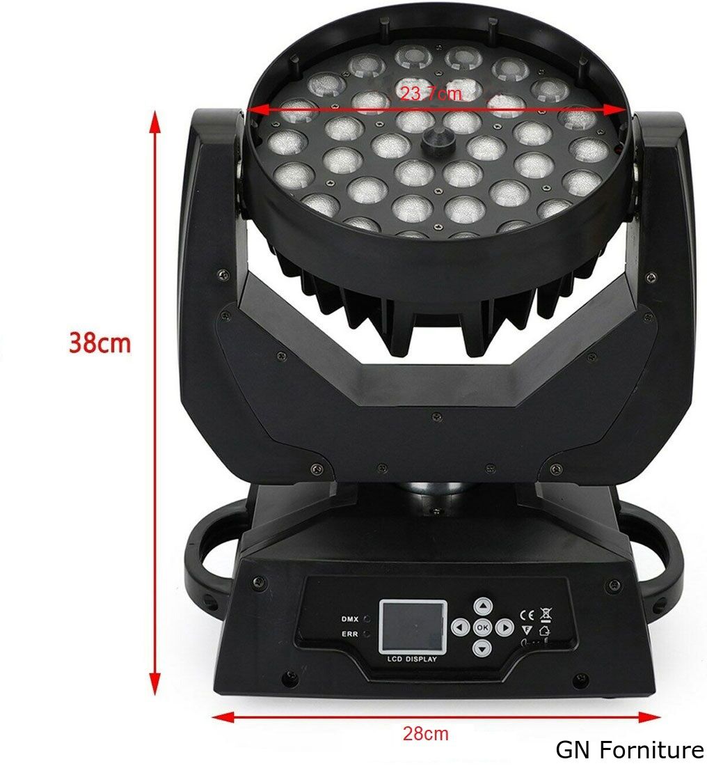La luce da palcoscenico a testa mobile con zoom è costruita con LED RGBW 4-in-1 da 36x10 W per produrre fasci colorati e una varietà di effetti luminosi, perfetti per l'illuminazione del palcoscenico.
