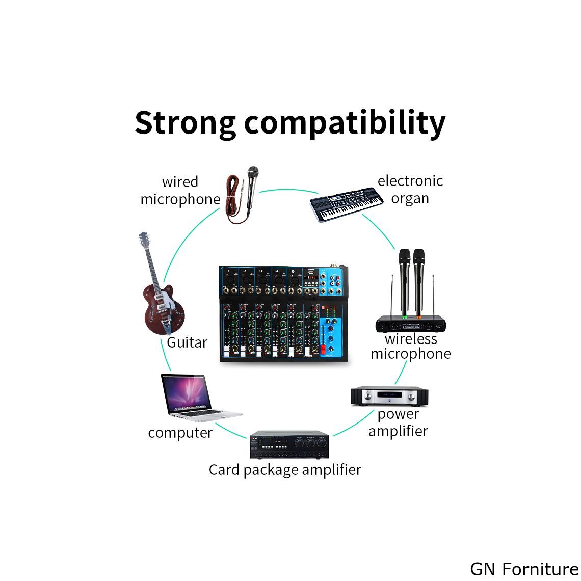- Mixer a 4/7 canali con due canali stereo e un canale stereo separato