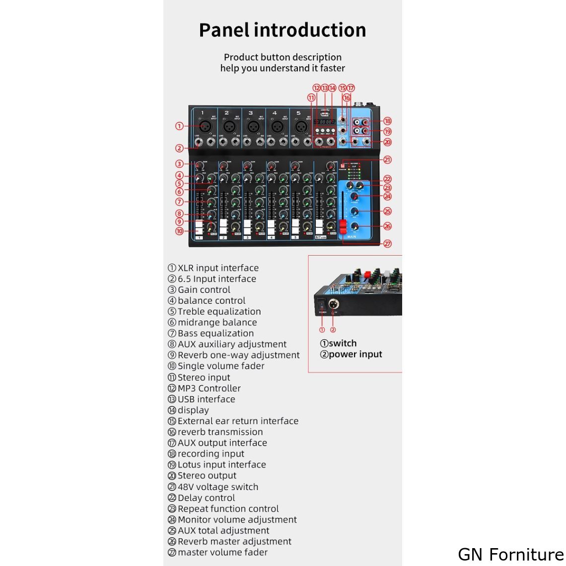 - Range Gain: line -8 +15dB / microfoni: +13 - +60dB