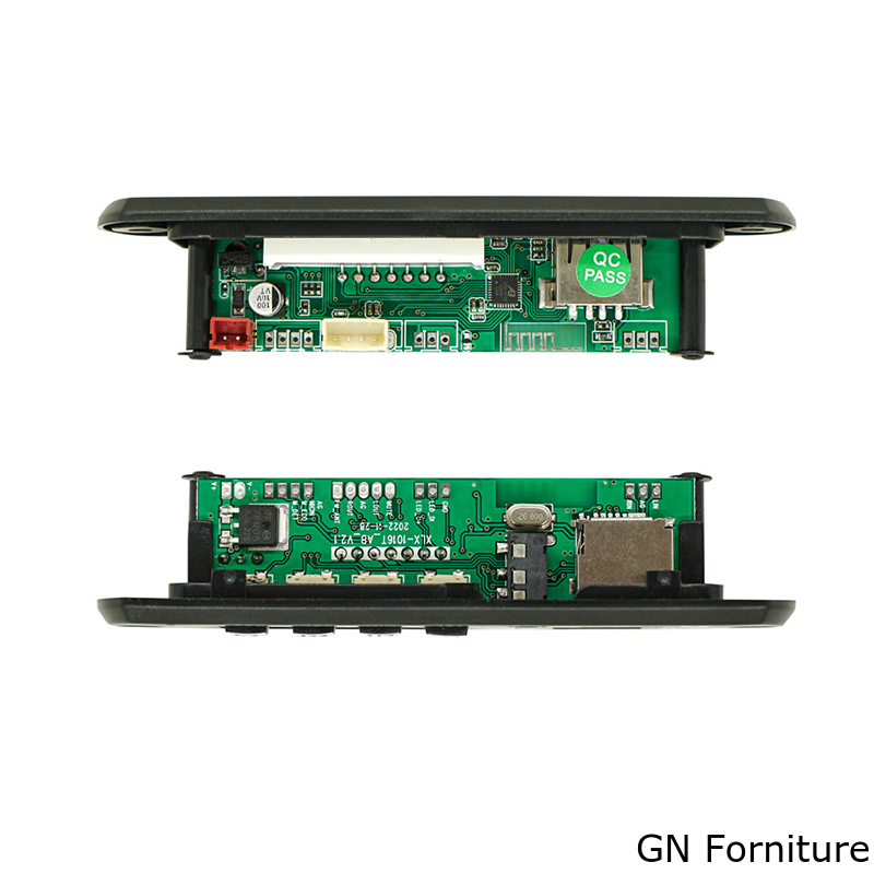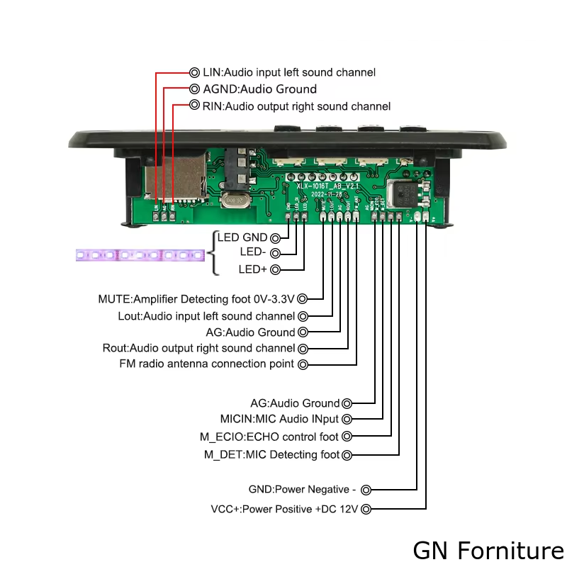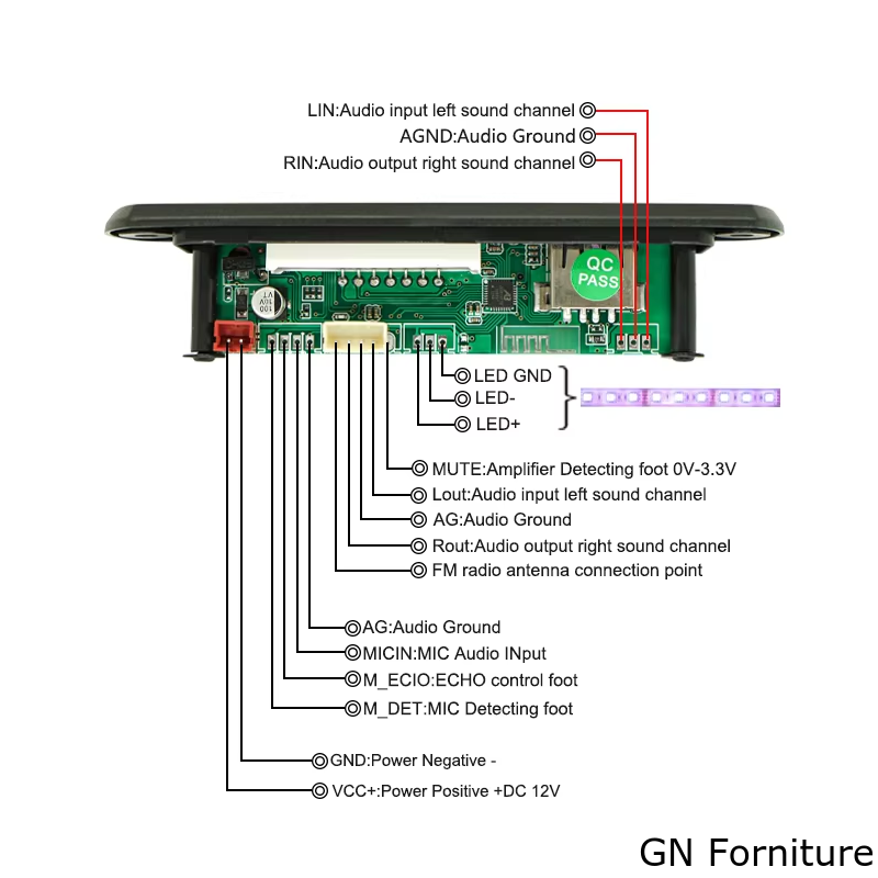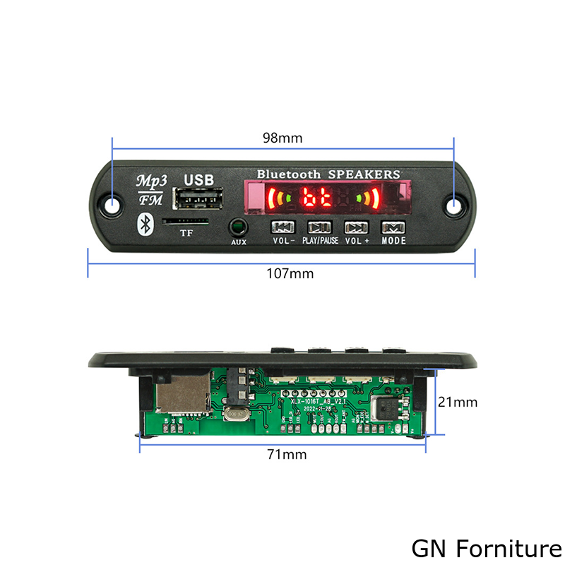Dal punto di vista installativo, la scheda è studiata per montaggio a pannello e si presta all’integrazione in diffusori attivi, casse personalizzate, impianti audio automotive, sistemi DIY e applicazioni multimediali compatte. L’alimentazione supporta 5V o 12V, rendendo il modulo versatile per diverse configurazioni elettroniche. Sul PCB sono inoltre presenti connessioni dedicate per ingresso e uscita audio, antenna FM, alimentazione, ingresso microfonico, rilevamento amplificatore e collegamento LED.