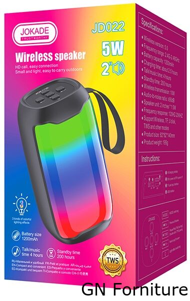 Speaker wireless portatile con effetto luminoso multicolore, ideale per ascoltare musica ovunque con stile. Dotato di tecnologia wireless 5.0 per una connessione stabile e veloce, integra una batteria da 1200mAh che garantisce fino a 4 ore di riproduzione continua e 200 ore in standby. Il driver da 2 pollici da 5W offre un suono chiaro e dinamico, con risposta in frequenza da 120Hz a 20kHz. Supporta diverse modalità di riproduzione, tra cui wireless, scheda TF, USB e funzione TWS per collegare due speaker e ottenere un effetto stereo.