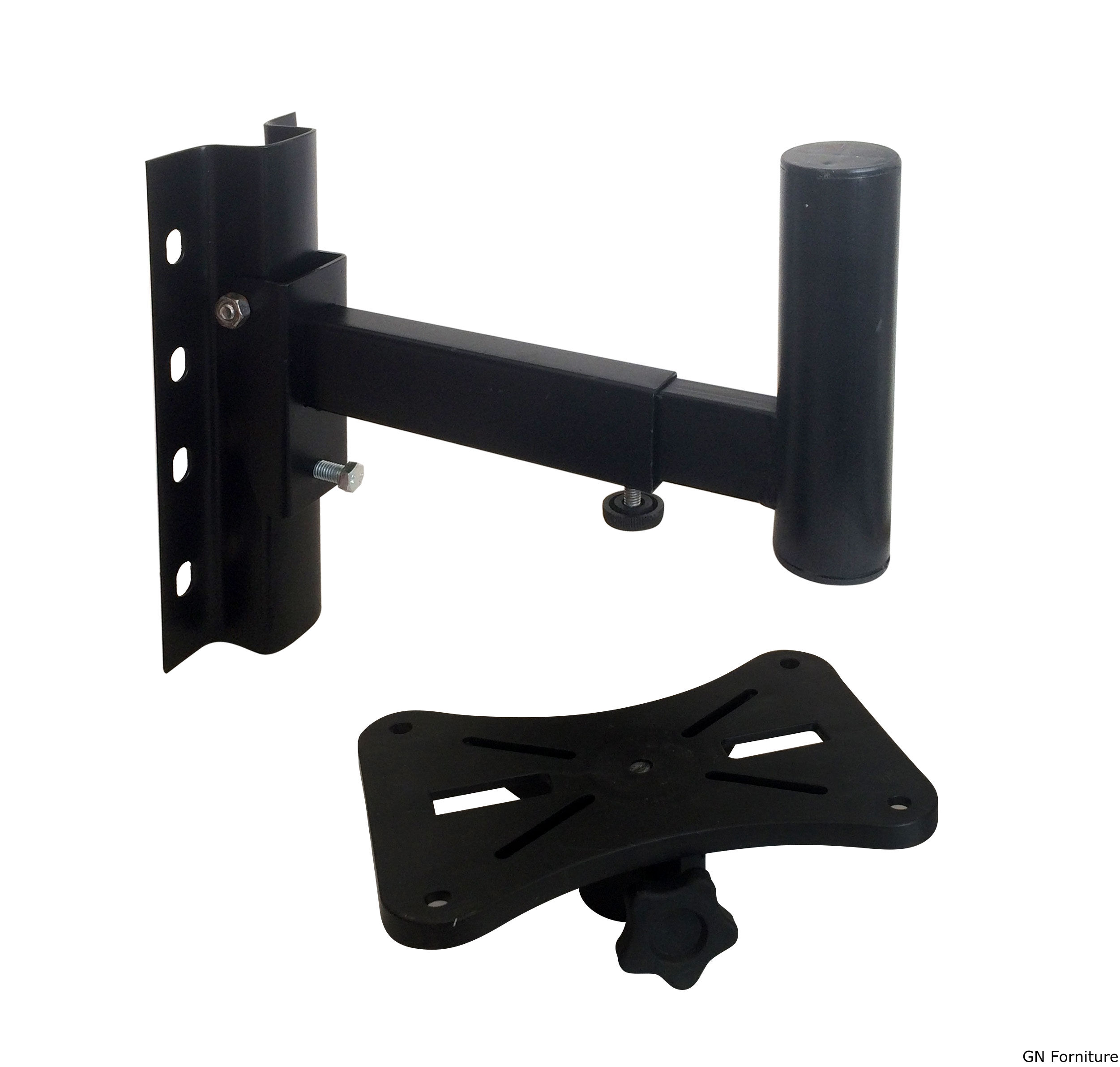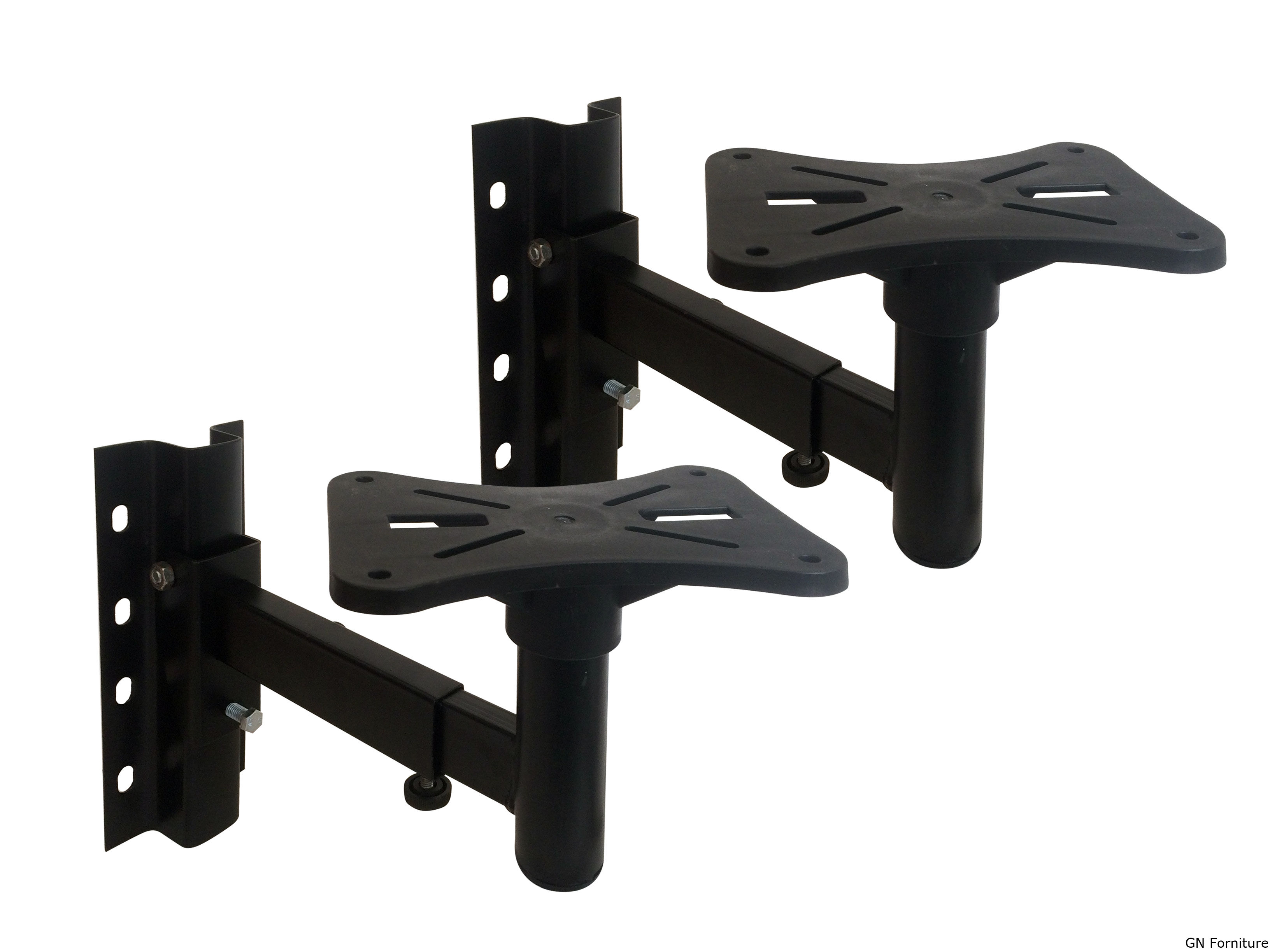 Queste staffe a parete per diffusori sono realizzate in acciaio saldato. Ognuna è dotata di una piastra regolabile per adattarsi a qualsiasi altoparlante con dimensioni standard.