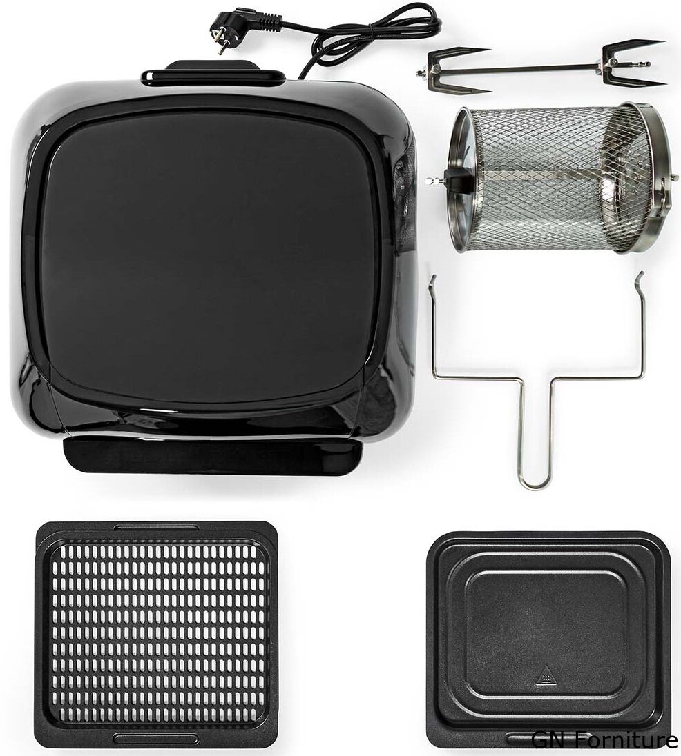 • Dotato di varie piastre da forno, due vassoi grill, un girarrosto per pollo, un cestino da rotisserie e un cestello a tamburo rotante