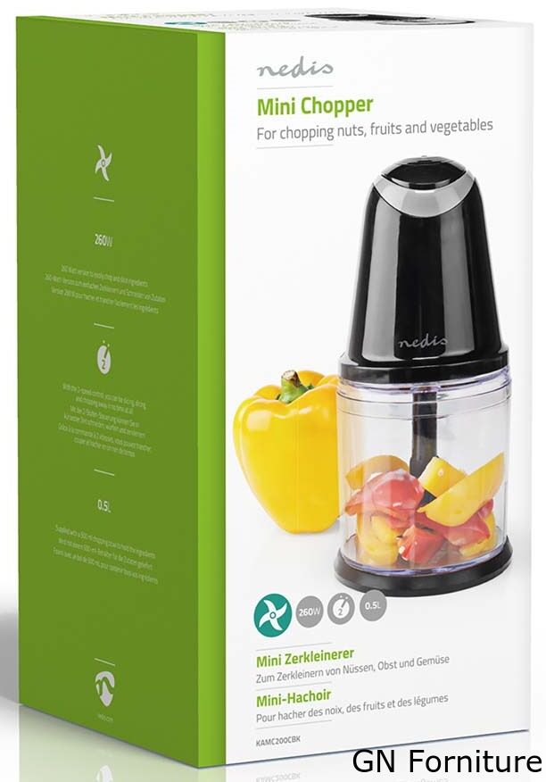 Questo mini tritatutto è l'apparecchio ideale in cucina quando devi tagliare e affettare gli ingredienti. Ti libera dalla fatica di tagliare e tritare sia la frutta secca, che frutta o verdure. Il tritatutto da 260 Watt con lame in acciaio inox si aziona in un attimo grazie a un pulsante sulla parte superiore che ne facilita il funzionamento. Il recipiente in plastica con coperchio ha una capacità di 500 ml. Al termine della tritatura, la pulizia è estremamente semplice, poiché tutte le parti rimovibili sono lavabili in lavastoviglie.