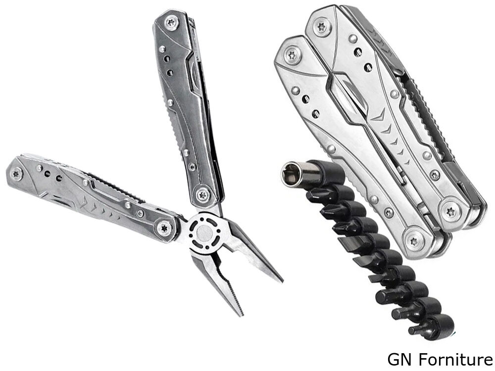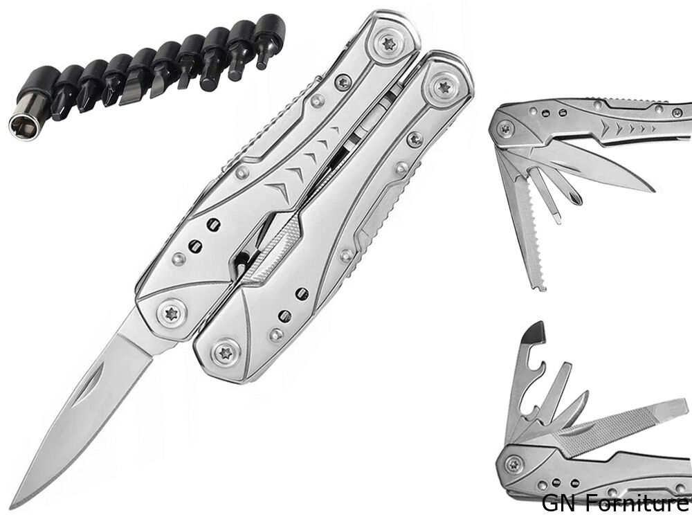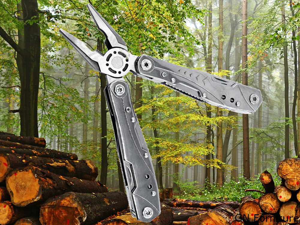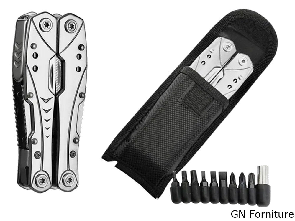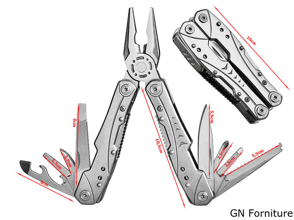 La pratica pinza multiuso è adatta a qualsiasi situazione quotidiana, così come per il campeggio o in officina. È compatta nelle dimensioni. La custodia con il dispositivo può essere riposta in una tasca o agganciata a una cintura.