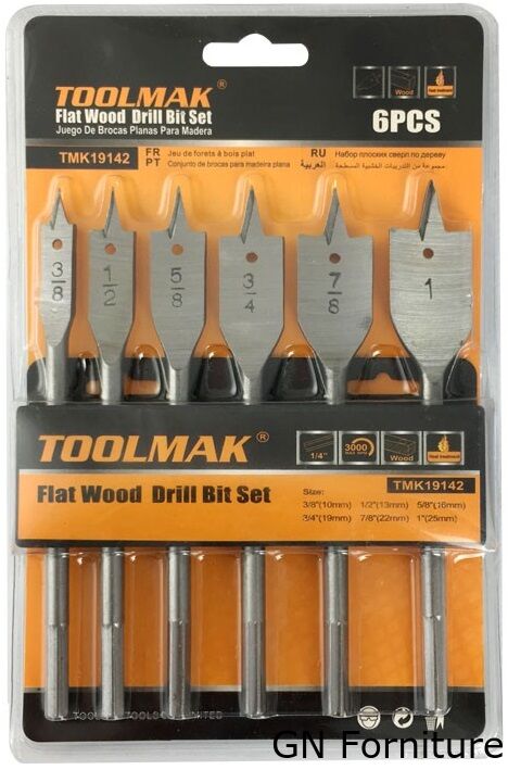 Set di punte a pala per legno TOOLMAK ideali per forature rapide e pulite su legno tenero, massello, compensato, laminati e pannelli MDF. Strumento essenziale per falegnami, hobbisti e professionisti.