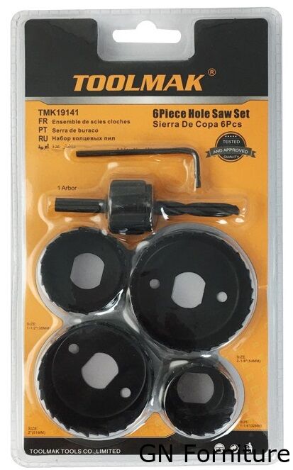 Set professionale di seghe a tazza TOOLMAK composto da 6 pezzi, ideale per forature precise su legno, plastica, cartongesso e materiali simili. Realizzato in acciaio al carbonio con trattamento di ossidazione nera per una maggiore durata e resistenza alla ruggine.