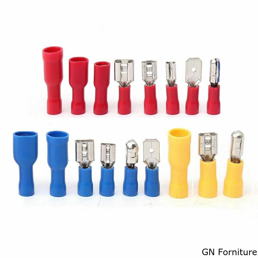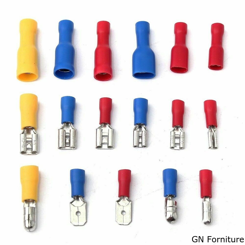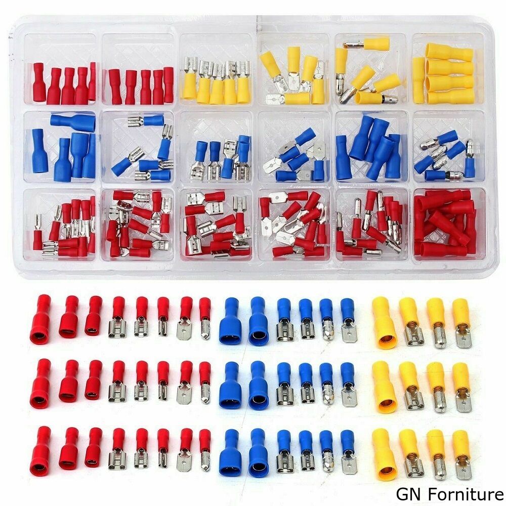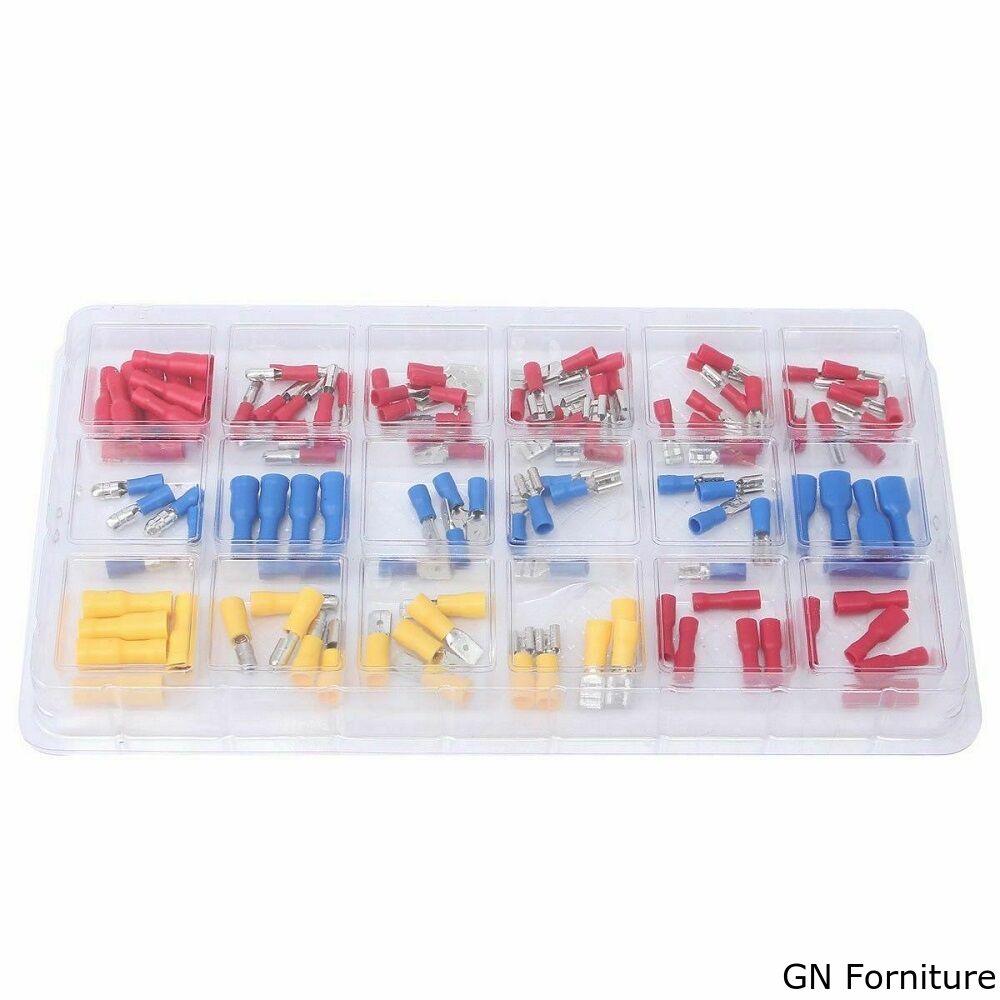 Assortimento di 120 capicorda preisolati in 18 diversi formati, piatti maschio, piatti femmina, a forchetta, a pressione ed altri.