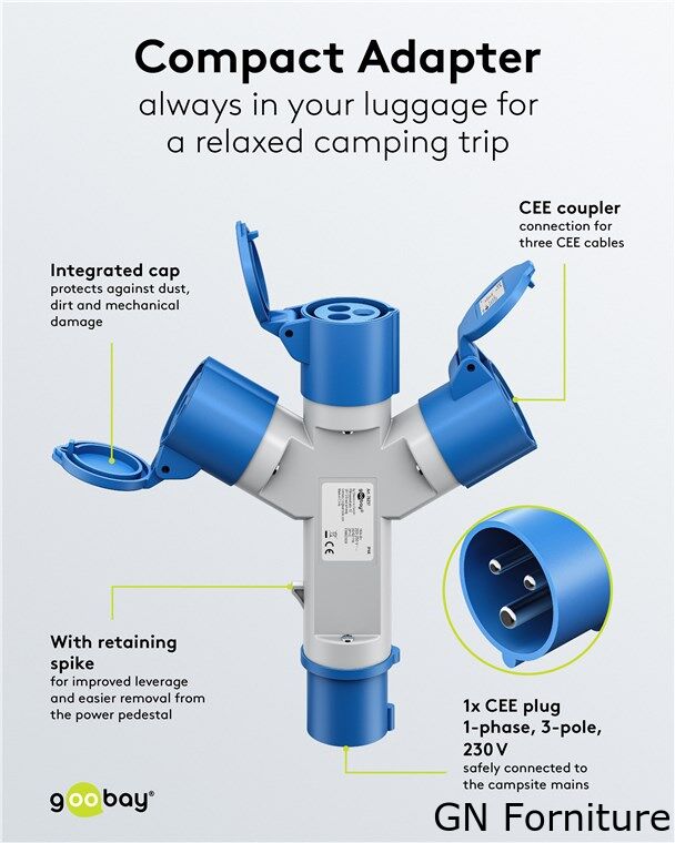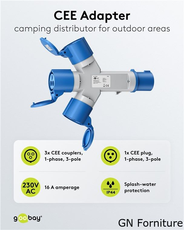 Adattatore CEE pensato per distribuire in modo pratico e sicuro l’alimentazione elettrica in campeggio, aree esterne coperte, caravan, camper, roulotte e anche in contesti di lavoro come cantieri. Questo distributore consente di trasformare una singola connessione CEE in tre prese CEE, offrendo maggiore flessibilità per collegare più dispositivi compatibili contemporaneamente. La struttura compatta e robusta lo rende comodo da trasportare e adatto all’uso in ambienti esterni.