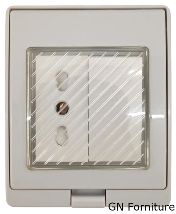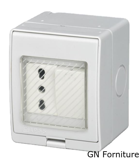 Presa elettrica da parete con protezione IP55, progettata per l’uso in ambienti esterni o umidi. Compatibile con spine italiane 2P+T (bipasso), è dotata di uno sportellino trasparente a chiusura ermetica che protegge da polvere, schizzi e pioggia.