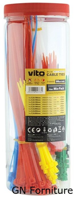Le fascette VITO PLASTICK CABLE TIES realizzate in NYLON6 (PA6) sono disponibili nei colori bianco, nero, rosso, giallo, verde e blu. Quella nera ha protezione UV.
