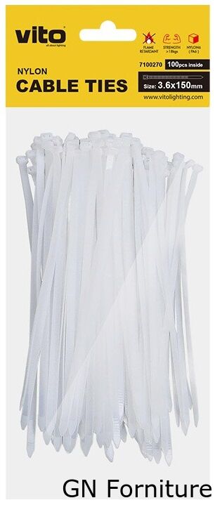 Le fascette per cavi VITO PLASTICK realizzate in NYLON 6 (PA6) sono di colore BIANCO e hanno un test di tensione di 18 kg. Nella confezione sono presenti 100 pezzi. La dimensione di una fascetta è 3,6X150 mm.