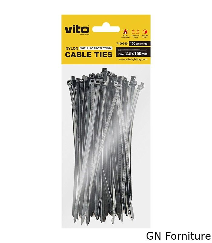 Le fascette per cavi VITO PLASTICK realizzate in NYLON 6 (PA6) sono di colore NERO con protezione UV e test di tensione di 8 kg. Ci sono 100 pezzi nella confezione. La dimensione di una fascetta è 2,5X150 mm.