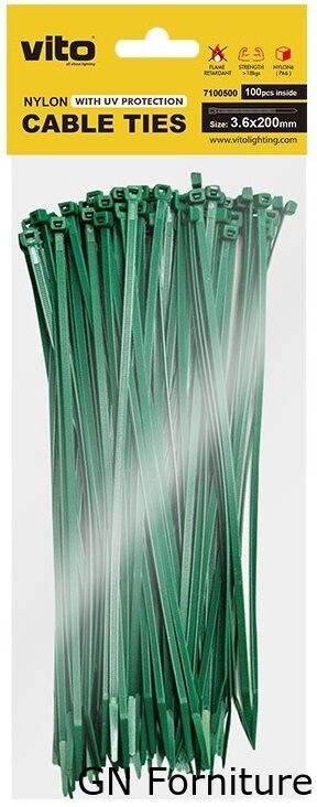 Le FASCETTE PER CAVI VITO PLASTICK realizzate in NYLON6 (PA6) sono di colore VERDE con protezione UV e test di tensione di 18 kg.
