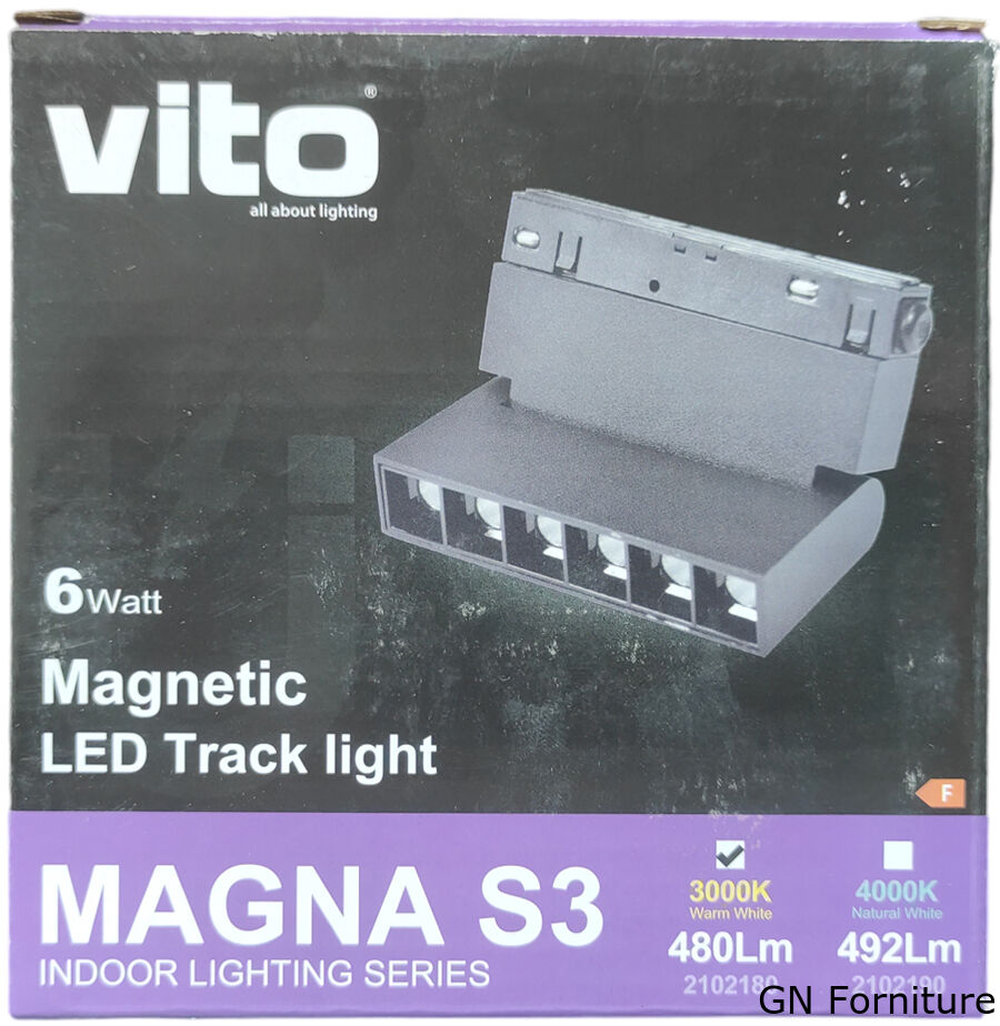 ILLUMINAZIONE A BINARIO serie MAGNA con corpo in alluminio e prestazioni di illuminazione pari a 480 Lm e una lunga durata di 25.000 ore. Questo modello da 6 W include LED da 3000 K (BIANCO CALDO) con un angolo di illuminazione di 24°.