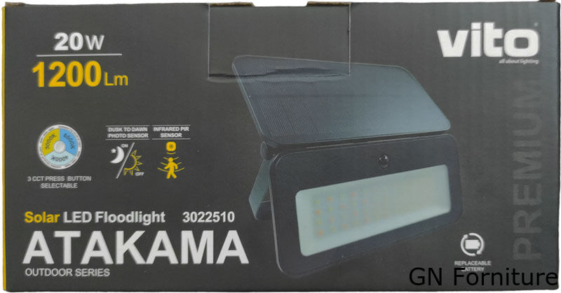 ATAKAMA 20, è un proiettore solare impermeabile, IP65, dotato di LED SMD, PIR e sensore crepuscolare. Braccio di montaggio in profilato d'acciaio, anch'esso verniciato in colore satinato sabbiato. Diffusore in vetro temperato Semi Trasparente dello spessore di 4 mm. Custodia in ABS di colore nero. Pannello solare in policarbonato e vetro. Pannello monocristallino fotovoltaico di nuova tipologia PET 5,5V - 2,5W.