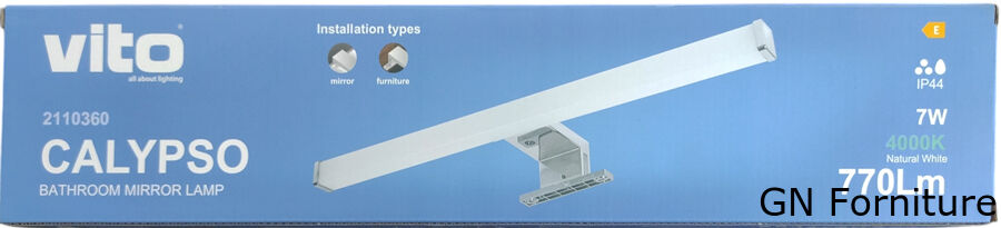 CALYPSO è un apparecchio di illuminazione da bagno impermeabile, dotato di tecnologia retroilluminata di sorgenti LED SANAN. Alloggiamento in pannello di alluminio verniciato elettrostaticamente con finitura sabbiata in cromo. Diffusore in PC. È destinato all'installazione sulla parte superiore dei mobili e non sullo specchio o sulla parete.
