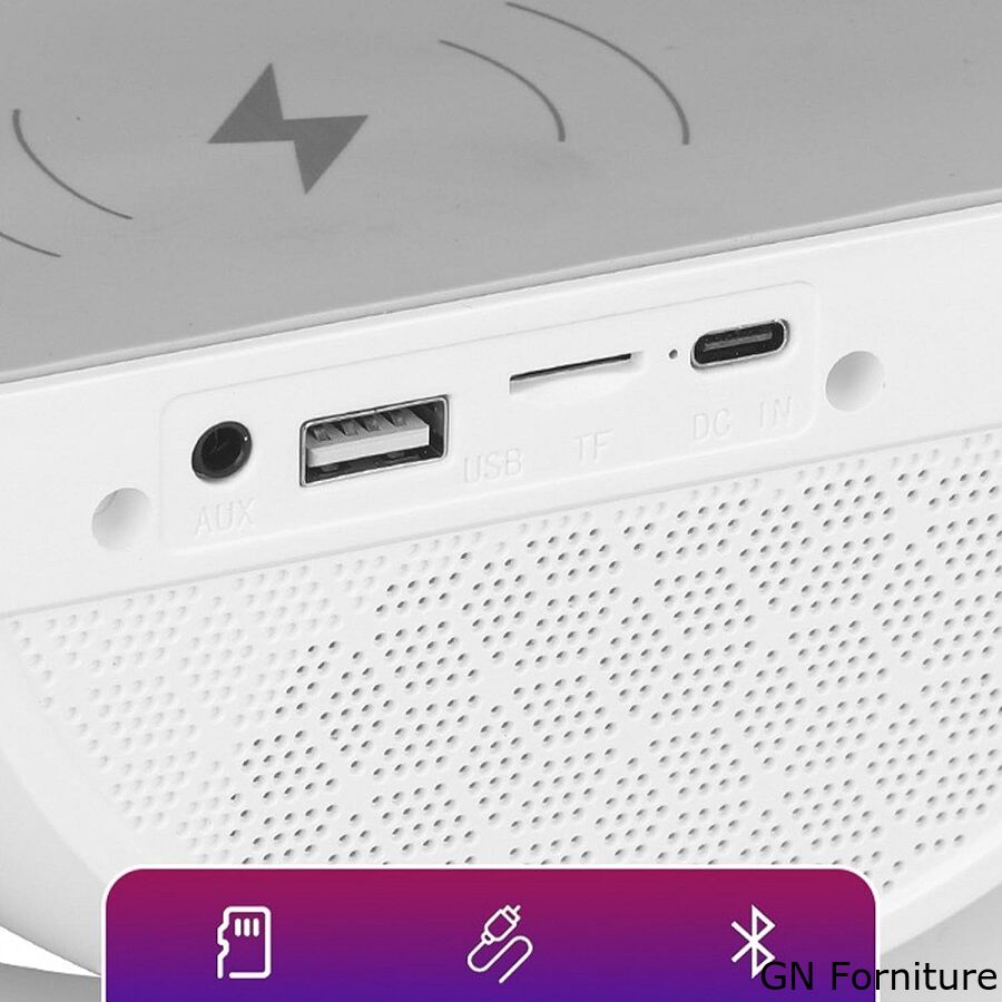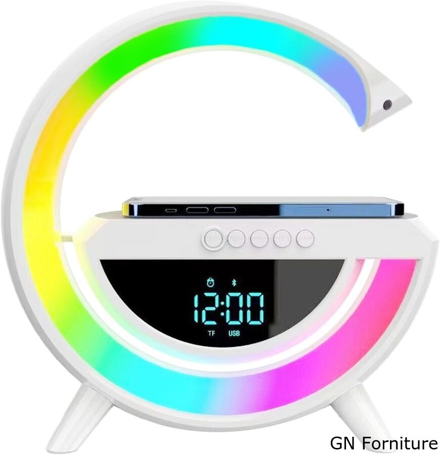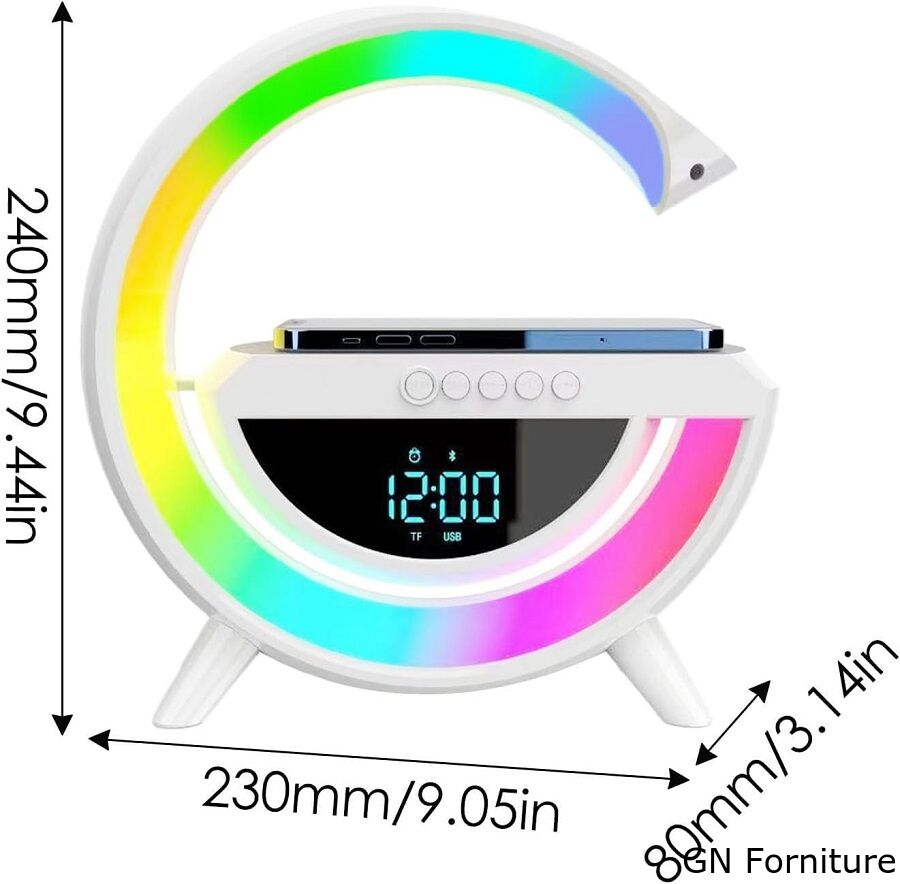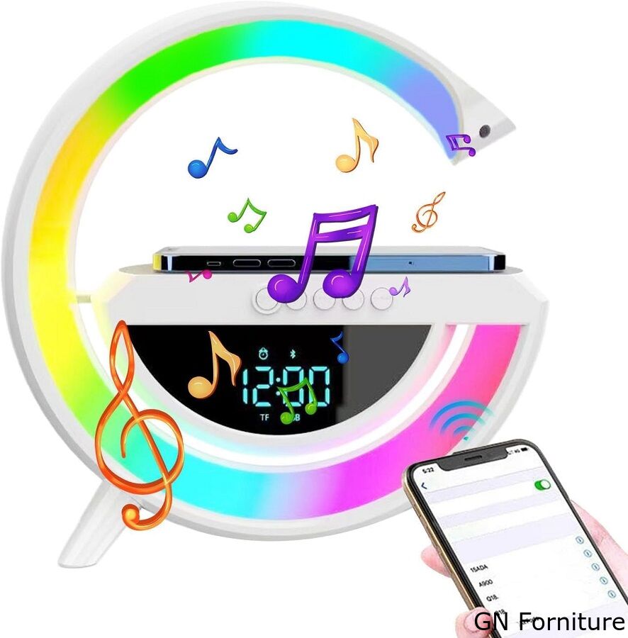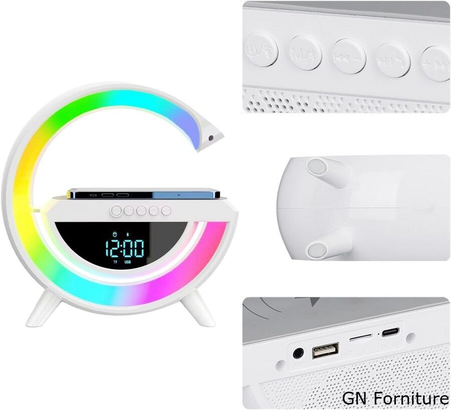 Lampada LED RGB Orologio/Radio FM/Bluetooth/AUX/scheda SD e ricarica wireless