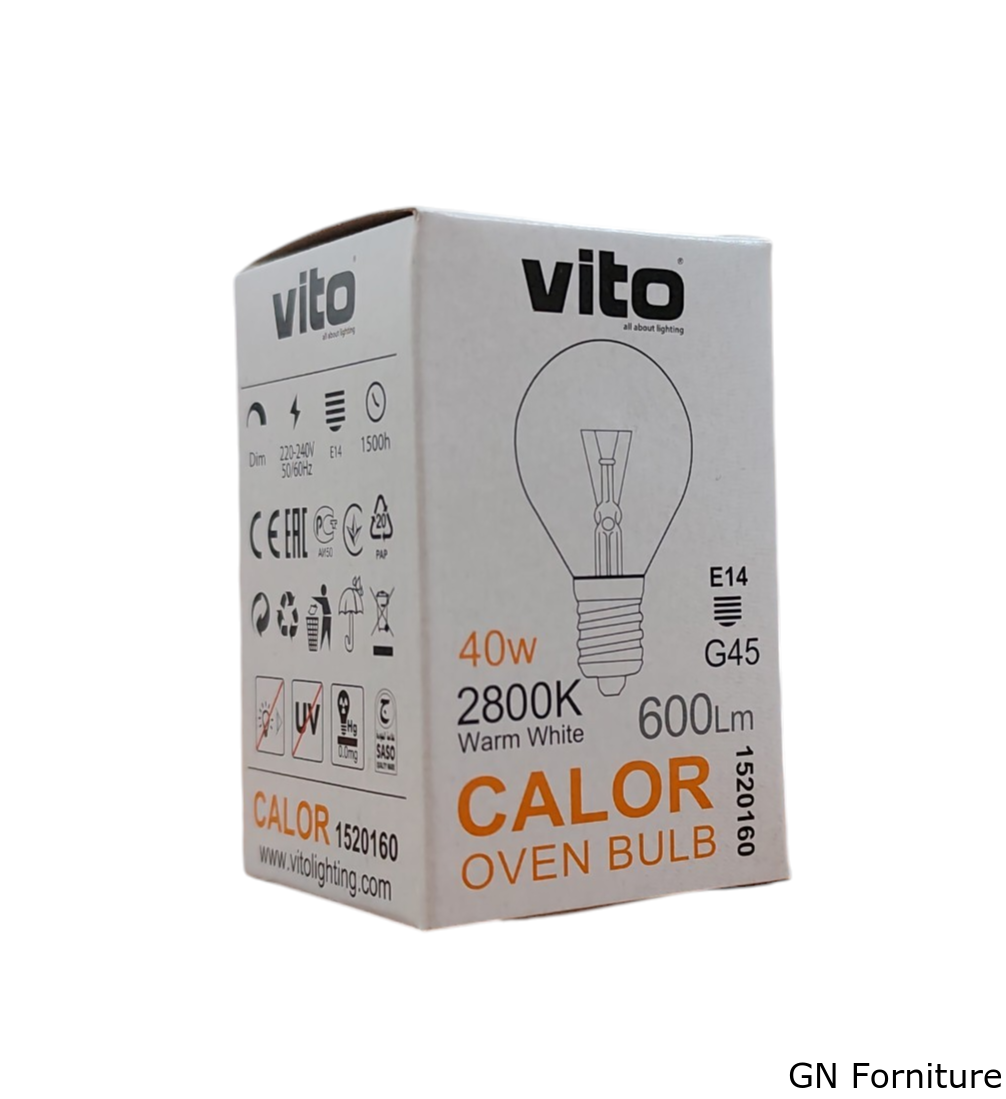 La lampadina per forno Vito Calor 40W è una soluzione affidabile per l’illuminazione interna di forni ed elettrodomestici compatibili che richiedono una sorgente luminosa con attacco E14. Il vetro trasparente e la luce bianco caldo da 2800K assicurano una buona visibilità dell’interno, contribuendo a controllare in modo pratico e immediato la cottura o il funzionamento dell’apparecchio. La forma G45 la rende adatta a installazioni dove sono richieste dimensioni compatte e una diffusione luminosa ampia.