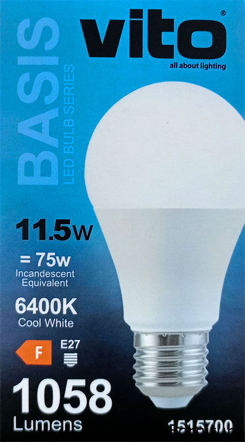 Questa lampadina da 11,5 W include LED da 6400 K (luce fredda) e attacco E27 con un angolo di luminosità di 270°.