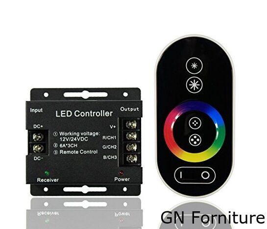 - Controller RGB a radio frequenza con telecomando touch con ghiera multicolore ed effetti. Ottimo prodotto che vi permetterà di creare atmosfera nel vostro ambiente preferito. Basterà inserire tra il vostro alimentatore per strisce Led RGB e la striscia stessa la nostra centralina e potrete regolare colore, effetti e luminosità