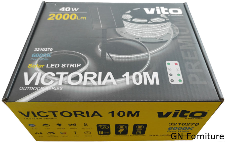 VICTORIA, è un set di strisce led solari impermeabili, IP65, con telecomando. Custodia in ABS di colore nero. Pannello solare in policarbonato.