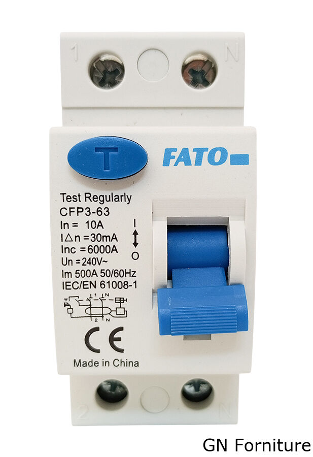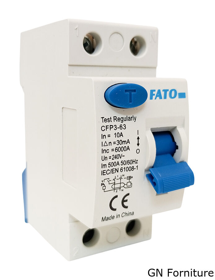 Interruttore differenziale bipolare della linea FATO CFP3-63, progettato per la protezione da dispersioni verso terra negli impianti elettrici. Include un pulsante di test per controllare il corretto funzionamento del dispositivo in qualsiasi momento.