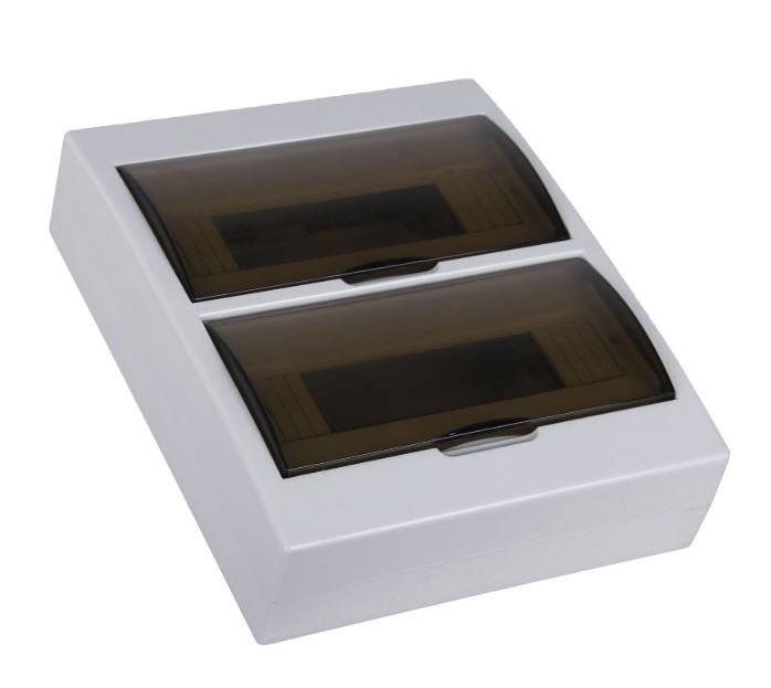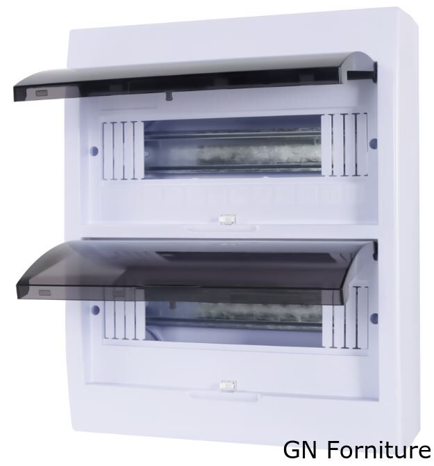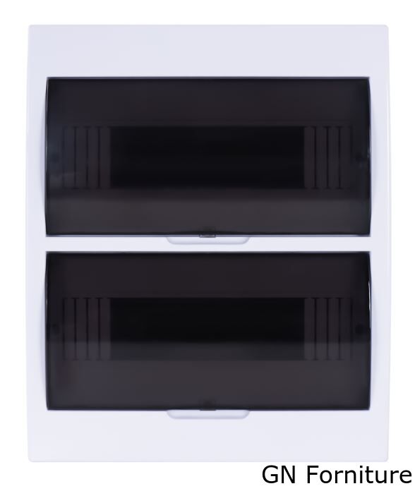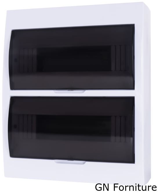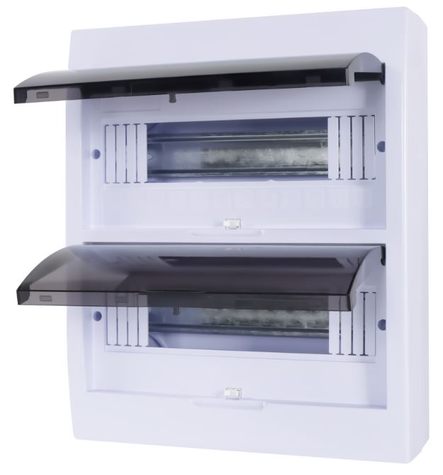 Quadro elettrico da parete con 24 moduli DIN, suddivisi su 2 file da 12, ideale per la gestione ordinata di impianti elettrici civili e commerciali. Dotato di doppia porta trasparente fumé, garantisce protezione e praticità nell’ispezione dei dispositivi installati.