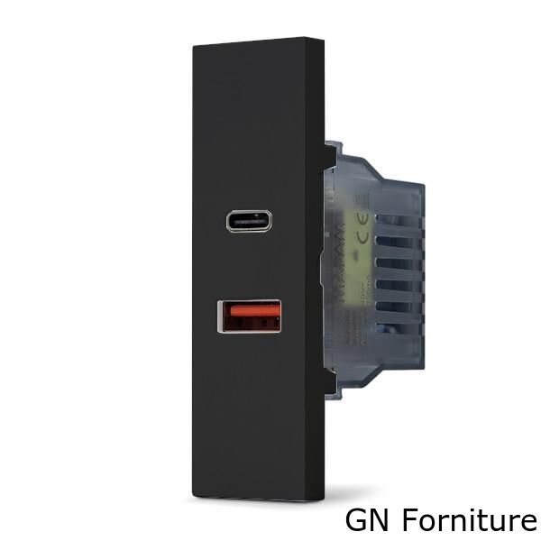 Doppia presa caricabatteria USB della serie ZEN, ideale per ricaricare in modo pratico smartphone, tablet, auricolari, power bank e altri dispositivi compatibili direttamente dalla parete, senza necessità di adattatori esterni. Il modulo integra una porta USB-A e una porta USB-C, offrendo maggiore versatilità nell’uso quotidiano sia in casa sia in ufficio.