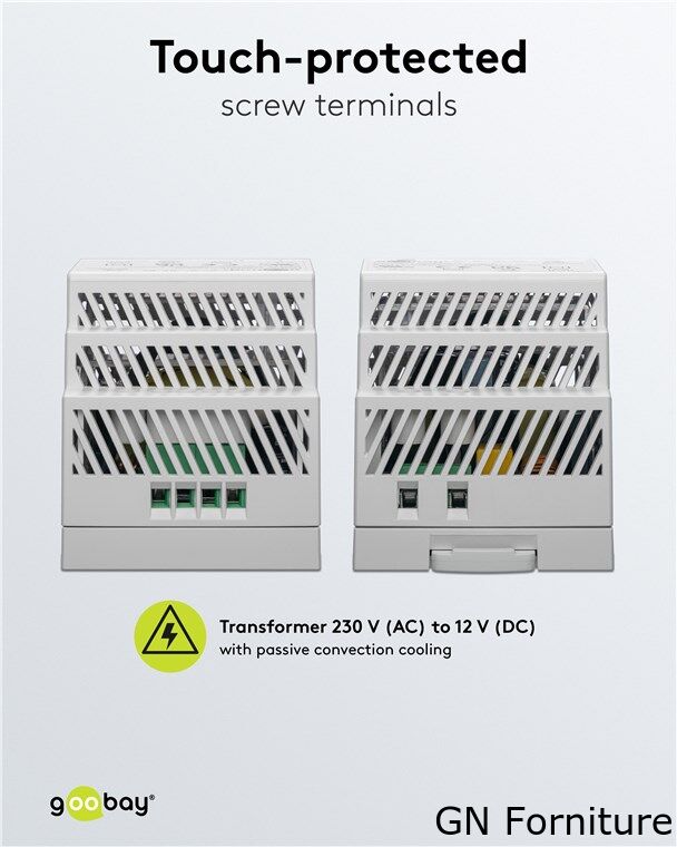 - Il trasformatore da 230 V a 12 V è raffreddato passivamente per convezione e collegato tramite morsetti a vite protetti dal tatto