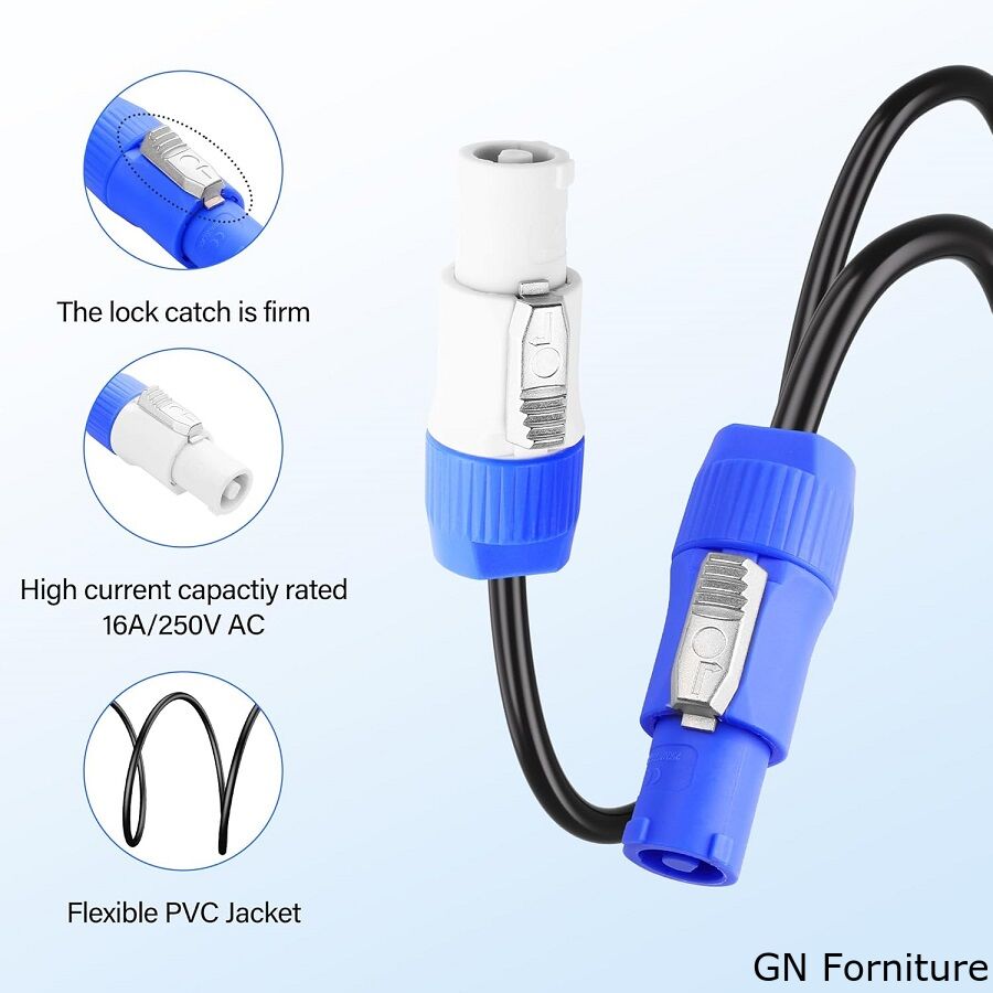 Cavo professionale PowerCon con connettore di ingresso (blu) e uscita (grigio), progettato per alimentare in modo sicuro e stabile dispositivi scenici, impianti audio professionali e sistemi LED. Grazie al conduttore in rame OFC e al connettore a blocco meccanico, garantisce affidabilità anche nelle installazioni più impegnative.