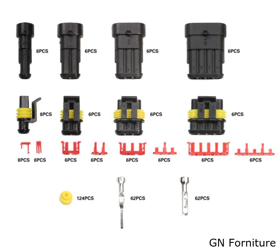 - 3Pin: (6 set) 6xconnettore alloggiamento maschio, 6xconnettore alloggiamento femmina, 18xpin maschio, 18xpin femmina, 36xsilicone spina impermeabile
