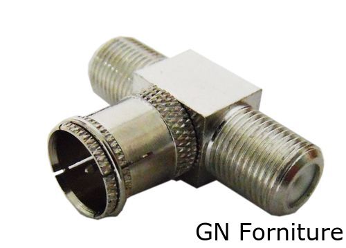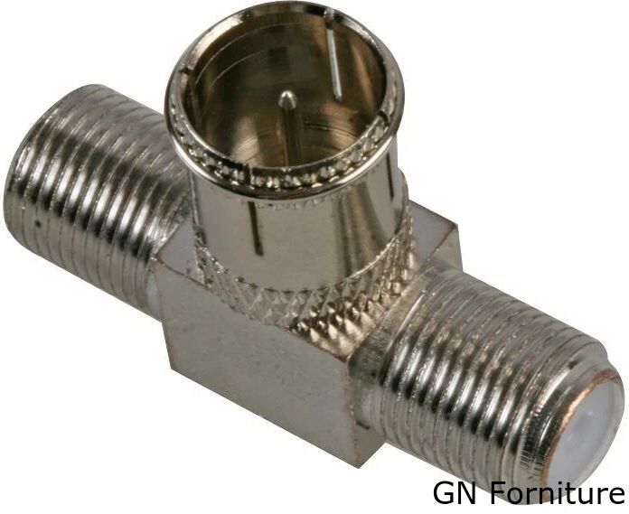 Adattatore coassiale a T con spina F maschio e doppia presa F femmina, ideale per la distribuzione del segnale TV satellitare o digitale terrestre su più dispositivi. Struttura in metallo nichelato per una trasmissione stabile e una lunga durata.