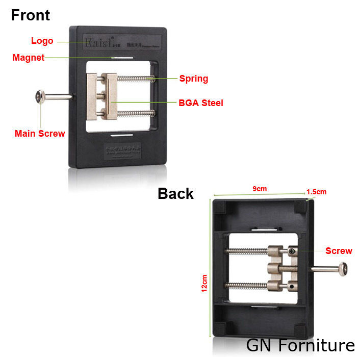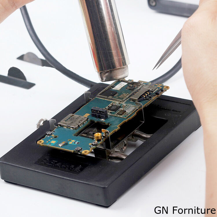 La sua base è stata progettata con un materiale plastico antistatico, dotata di piedini in gomma e un meccanismo di morsetti regolabili con un sistema di scorrimento che permette di bloccare il componente in base alla sua dimensione.