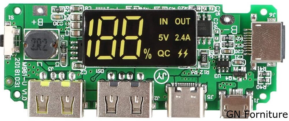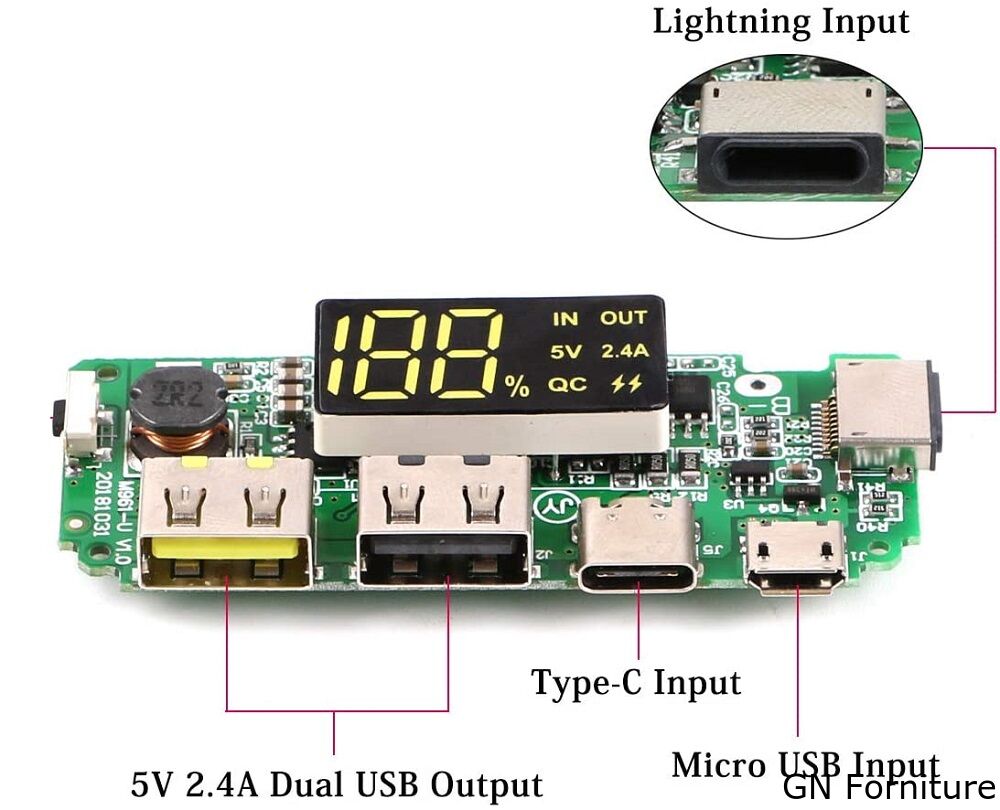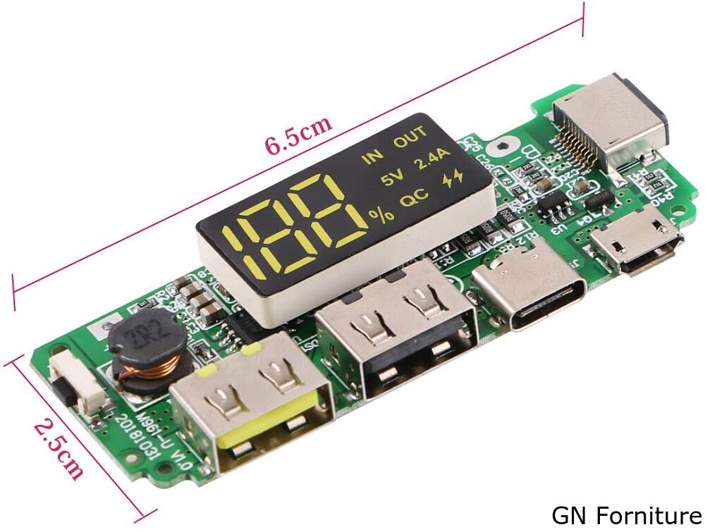 - Dimensioni: 6,5 * 2,5 * 0,1 cm; Doppia corrente di uscita: 5 V 2,4 A; Tensione di ingresso da B + a B-: 3,0 - 4,2 V.