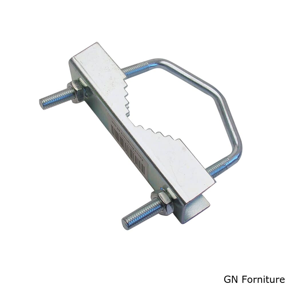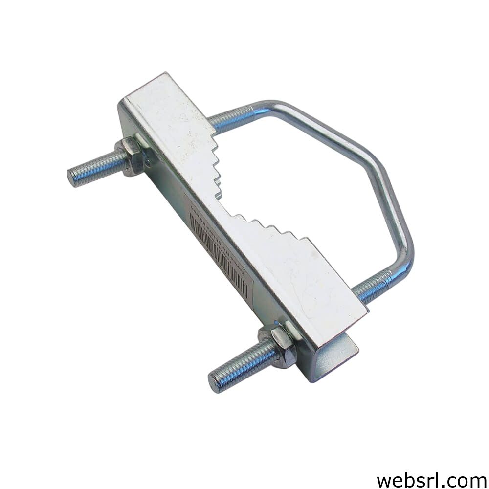Zanca per il fissaggio a ringhiere di pali con diametro da 25 a 55 mm. Dado M6, filettatura cm 9, spessore piastre 2,5 mm