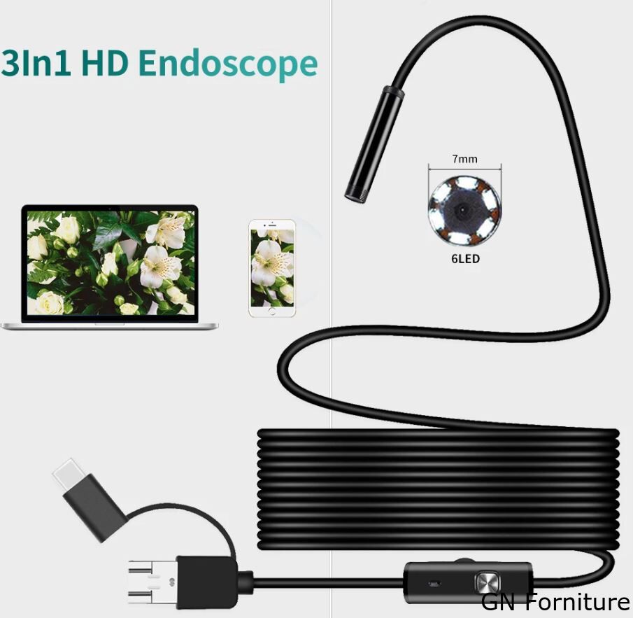 La telecamera endoscopica flessibile è una periferica plug-and-play impermeabile dotata di un cavo lungo 5 metri, LED ad alta luminosità e collegamento commutabile USB/Micro-USB/USB Type C.
