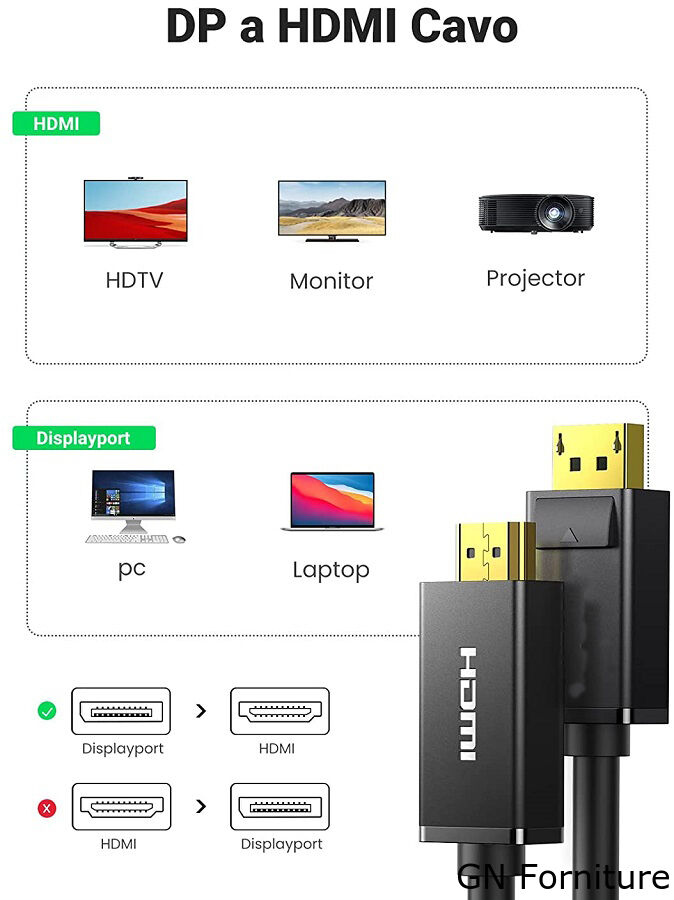 - Displayport a HDMI: Cavo DisplayPort a HDMI progettato per collegare i dispositivi DisplayPort (come: PC, schede grafiche ecc ) con HDTV, monitor, proiettori, occhiali VR o gli altri dispositivi HDMI per realizzare la riproduzione sul grande schermo.