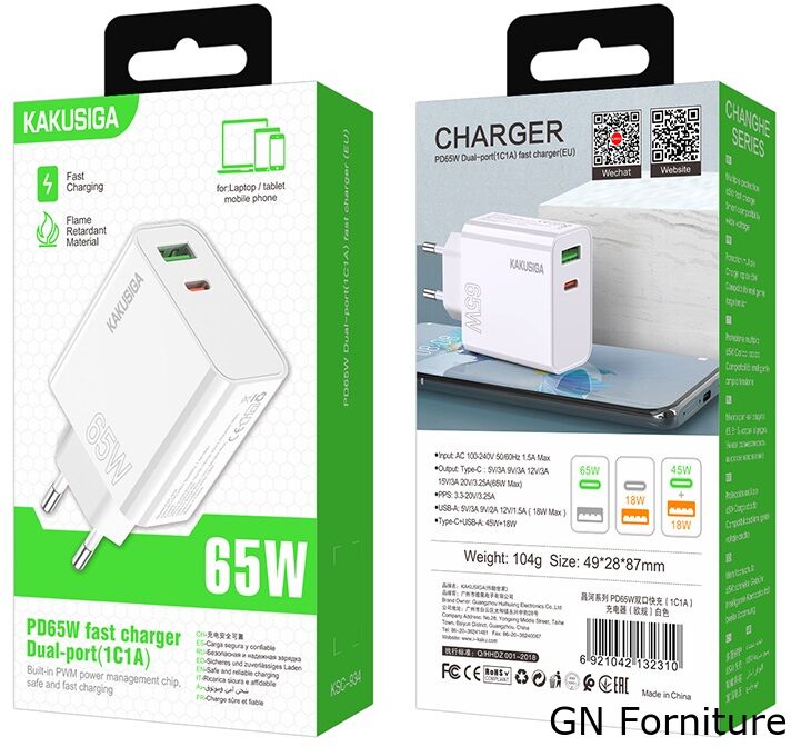 Supporta PD 65W, QC3.0, AFC, FCP, VOOC 2.0, compatibile con il 99% di dispositivi; ricarica rapida intelligente, protocollo di riconoscimento corrente/potenza da erogare
