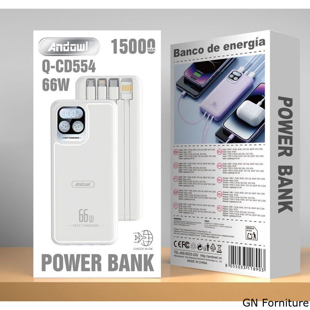 Mantieni sempre carichi i tuoi dispositivi con questo power bank da 15000mAh, progettato per offrire praticità, velocità di ricarica e massima versatilità nell’uso quotidiano. Grazie alla potenza fino a 66W, è ideale per alimentare rapidamente smartphone, tablet, console portatili e altri dispositivi compatibili, sia a casa che in viaggio.
