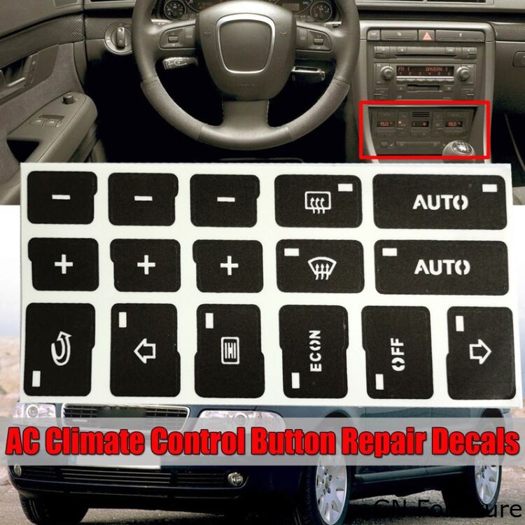 Se i pulsanti dell'aria condizionata della tua Audi A4, modello B6 o B7 (anni 2000-2004), sono consumati e i simboli illeggibili, questo set di adesivi e la soluzione piu rapida ed economica per far tornare il tuo cruscotto come nuovo.